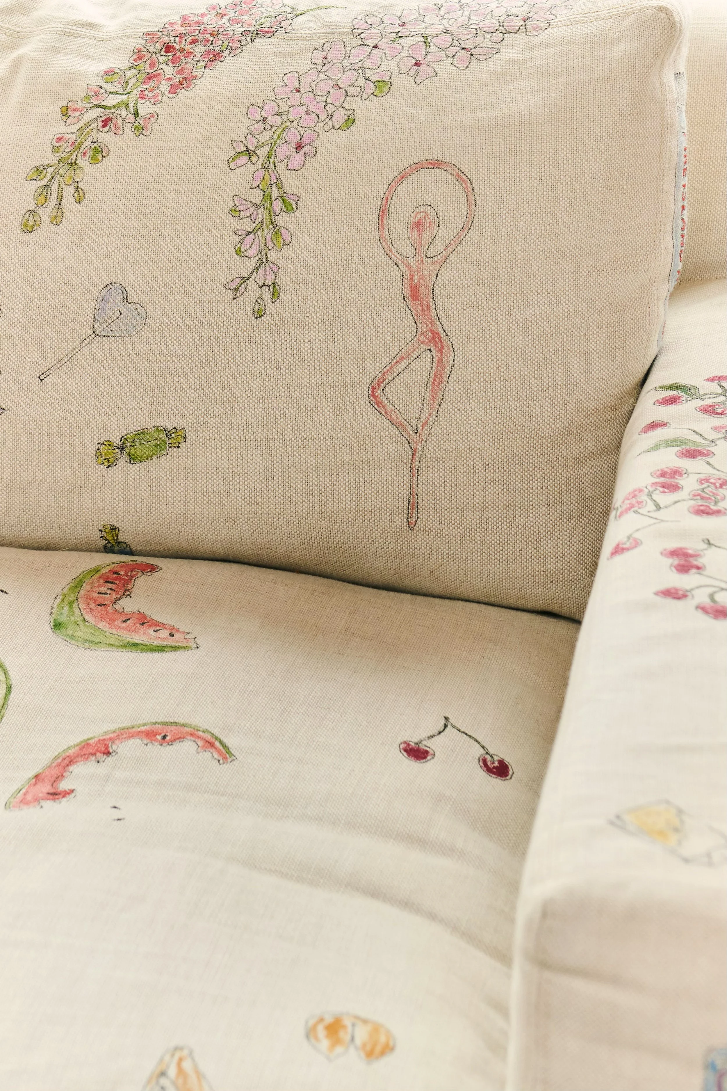 Storybook couch with painted stories, family lore, and inside jokes